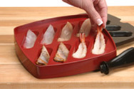 Remove the top mould to reveal 8 perfectly shaped rice balls, seafood and wasabi moulded together.